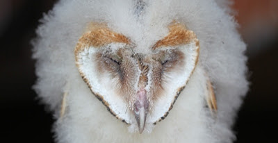 Yesterday morning, we were greeted by this barn owl chick. It is just beginning to develop its immature plumage on its wings. They are hideous and lack charm until they fledge.